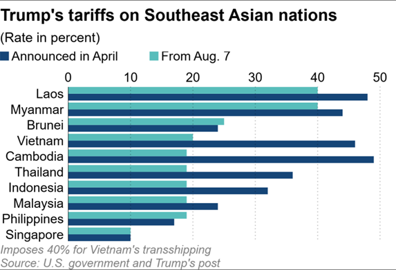 En un a escala regional, Entre abril y agosto de 2025, varios países del sudeste asiático experimentaron aumentos significativos en los aranceles impuestos por EE. UU. En el caso de Tailandia, los aranceles pasaron del 20% al 37%, mientras que Vietnam y Camboya subieron hasta cerca del 45–50%. Otros países, como Singapur, se mantuvieron relativamente estables en torno al 10%, reflejando un impacto menor.