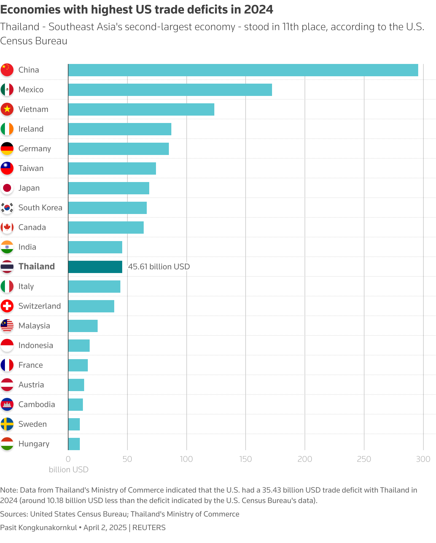 Tailandia se ubica en el 11.º lugar mundial con un déficit de 45,61 mil millones de USD, siendo la segunda economía del sudeste asiático tras Vietnam. Este dato evidencia la alta dependencia del país del comercio con Estados Unidos, lo que lo hace vulnerable a cambios en aranceles o en la demanda externa. La posición de Tailandia en este ranking también explica por qué decisiones políticas, como la continuidad fiscal o el estímulo a la inversión interna, se vuelven críticas para sostener el crecimiento económico y proteger la competitividad frente a vecinos como Vietnam, que podrían captar parte del turismo o exportaciones desplazadas.